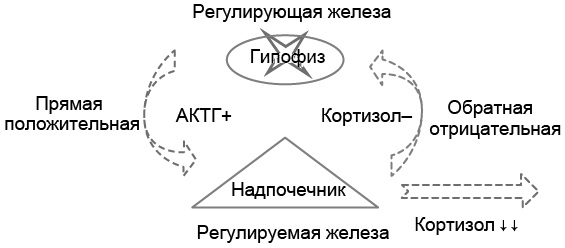 Рис. 4.1. Регулирующая железа гипофиза синтезирует адренокортикотропный гормон (АКТГ), который стимулирует образование кортизола в регулируемой железе надпочечнике (прямая положительная связь), а кортизол надпочечников подавляет секрецию АКТГ гипофиза (обратная отрицательная связь)