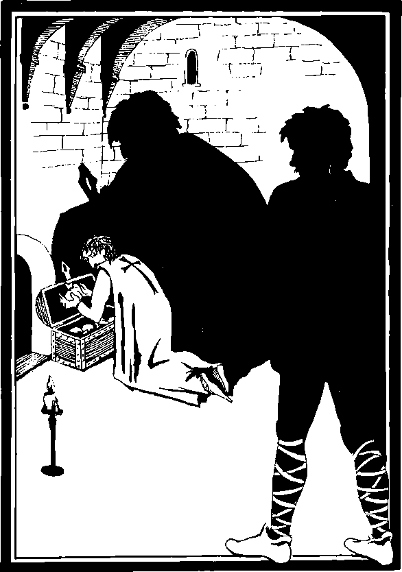 Около получаса он шел по совершенно пустынным коридорам и переходам и в конце концов очутился перед какой-то дверью. Маленький Джон открыл ее и увидел старика: наклонившись над окованным железом сундуком, он бережно укладывал мешочки, наполненные золотыми монетами. Он старательно считал их, а потому не сразу заметил, что it комнате есть кто-то еще.