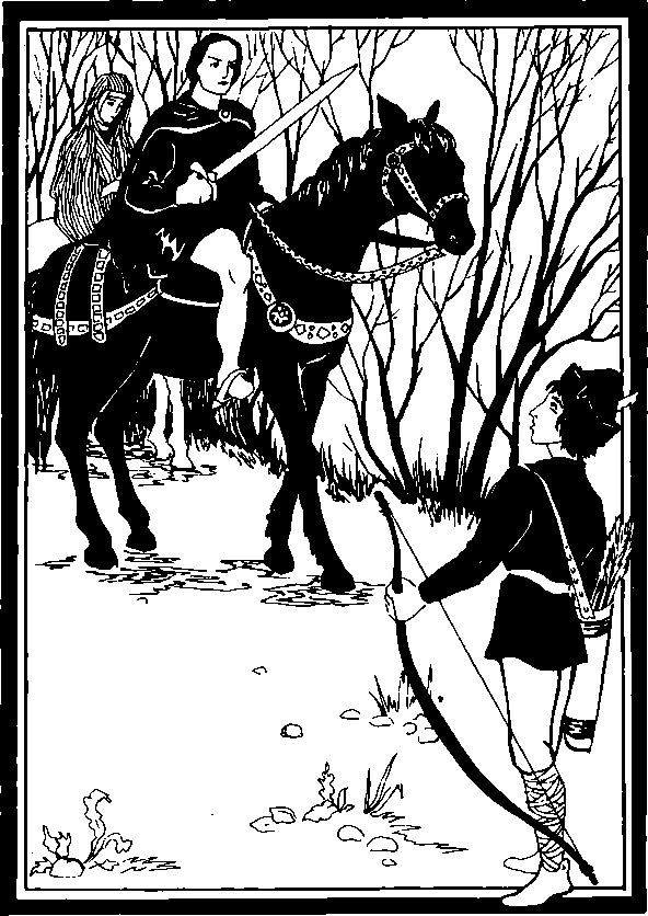Робин уже собирался выйти из своего убежища и познакомиться с этим незадачливым стрелком, как вдруг, нечаянно раздвинув ветви бука, увидел на том месте, где дорога в Мансфилд-Вудхауз делает поворот и от нее отходит тропа, всадников: какого-то дворянина, а с ним молодую даму, которые явно пребывали в нерешительности – продолжать ли им путь, пренебрегая опасностью, или же повернуть обратно. Лошади храпели, а дворянин оглядывался по сторонам, чтобы высмотреть врага и оказать ему сопротивление, и одновременно пытался успокоить свою спутницу.