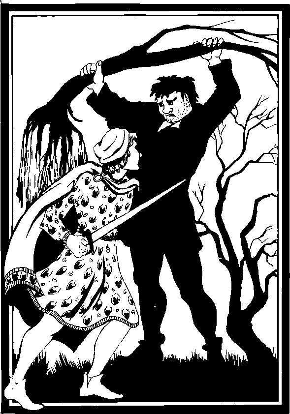 Обезумев от ярости, Черный Питер вырвал с корнем молодое деревце, снова бросился на Аллана и с такой силой ударил его по голове, что тот выронил меч и без чувств упал на землю.