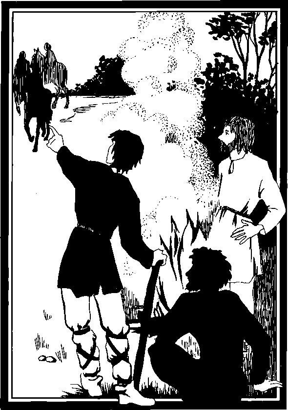 Слуги прелата бросились на лесных братьев, и, если бы Робин не затрубил в рог, пролилась бы кровь, но по этому сигналу с разных сторон поя вились остальные разбойники: предупрежденные о том, что епископ уже здесь, они понемногу подтянулись к этому месту.