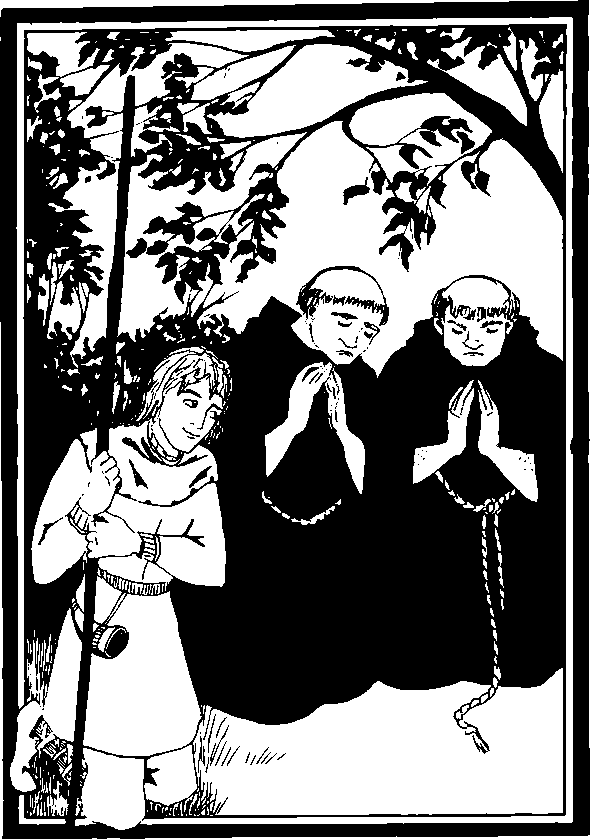 Однажды утром Робин Гуд узнал, что два монаха несут в свое аббатство немалые деньги и должны пройти через Шервудский лес. Новость эта очень обрадовала Робина, потому что казна у нас опустела и деньги эти были нам очень кстати. Никому ничего не сказав (взять двух монахов – дело нетрудное), Робин оделся пилигримом и встал на дороге, по которой они должны были пройти.