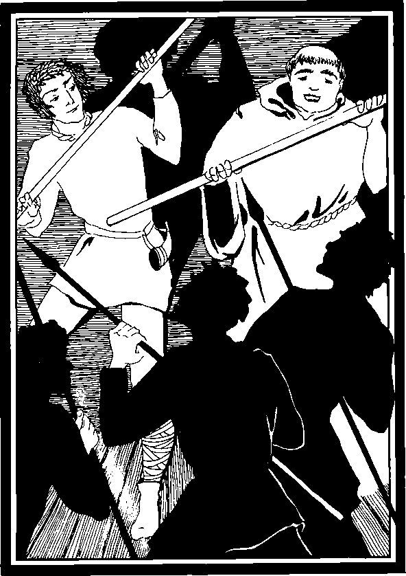 Не успел Робин подойти к дерущимся, как один из разбойников, огромный, как Геркулес, свирепо и насмешливо ухмыляясь, отступил на шаг перед Линкольном и монахом, обернулся к юноше и сделал выпад. Но Робин не потерял хладнокровия и, отразив удар копья, который мог бы проткнуть его насквозь, ответил на него прямым горизонтальным ударом в грудь, заставившим бандита отлететь к стене и сползти по ней.