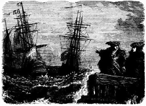 На шканцах адмиральского корабля под балдахином из бархата, отделанного горностаем, сидели вдовствующая королева и молодая принцесса; подле них стоял адмирал, граф Норфолк. Они с ужасом следили, как шлюпка то взлетала к небу, то проваливалась в пучину, а на темном фоне ее паруса выделялись фигуры французских дворян.