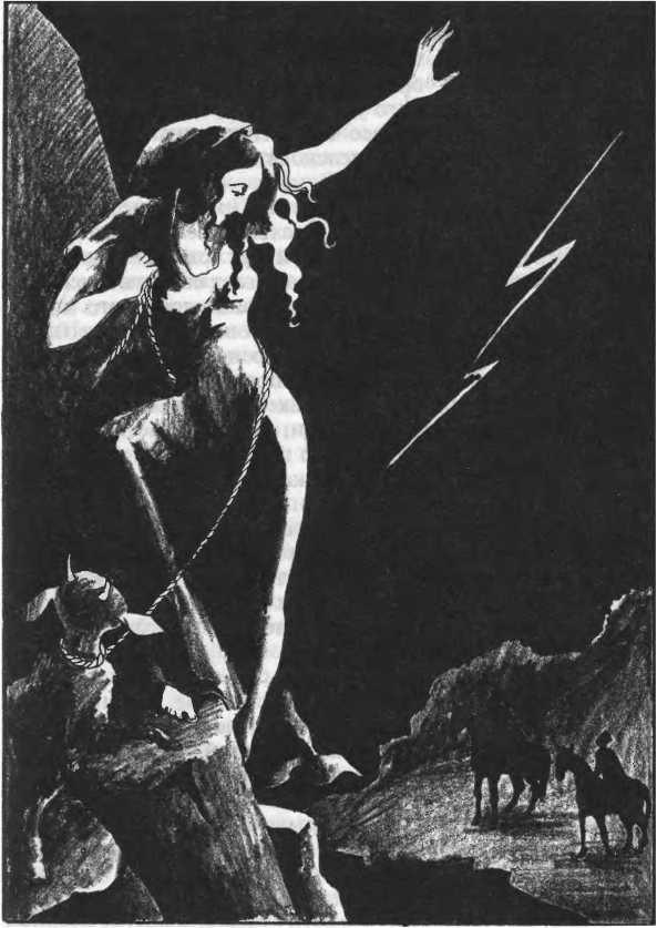 Перед ними предстала молодая девушка, босая, с голыми руками и распущенными волосами, едва прикрытыми черным капюшоном, раздувавшимся от ветра, в юбке неопределенного красноватого оттенка, ярко сверкнувшей при свете молнии. Ее черты поражали странной диковатой красотой. Рука девушки сжимала веревку, другим концом обвитую вокруг шеи какого-то рогатого животного.
