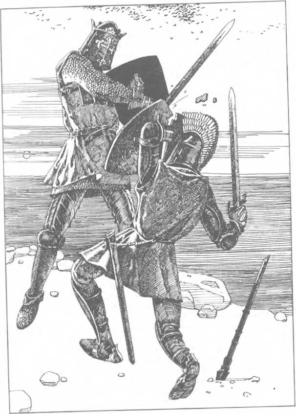 Но прежде чем позволить им продолжать борьбу, оруженосцы увели с ристалища коней, а пажи подобрали копья, отброшенные соперниками. Очистив таким образом арену, оруженосцы и пажи ушли, а судьи турнира подали сигнал продолжать поединок.