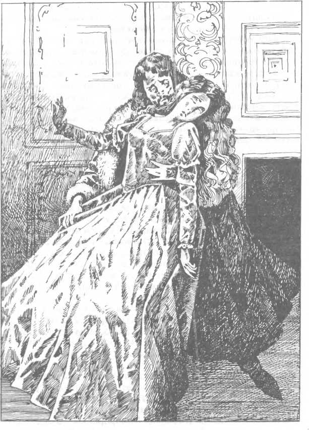 У ворот графа встретили поджидавшие его офицеры; он, правда, хотел, чтобы не они вышли его встречать. Обычно первой навстречу ему выходила Алике, но он ее не увидел. Однако сколь бы быстро он ни въехал по тропе на площадку, у слуг было время ее предупредить. Неужели ее нет в замке? Но если нет, то где она может быть? Вот почему первым словом, что произнес граф, было имя жены. Но оруженосец, державший в поводу его коня, молча показал на замок. Граф, боясь расспрашивать дальше, спешился и вбежал во двор; там он на секунду остановился, потому что, не увидев, как ожидал, графиню на парадной лестнице, граф окинул глазами все окна, надеясь в одном их них ее заметить, но все окна были закрыты. Тогда он стремительно, насколько позволяла тяжесть доспехов, вбежал по лестнице и направился в покои жены. Все комнаты, что ему пришлось проходить, чтобы туда попасть, были пусты; распахнув последнюю дверь, он увидел на пороге комнаты графиню, облаченную в траур и такую бледную, что, казалось, она вот-вот отдаст Богу душу.