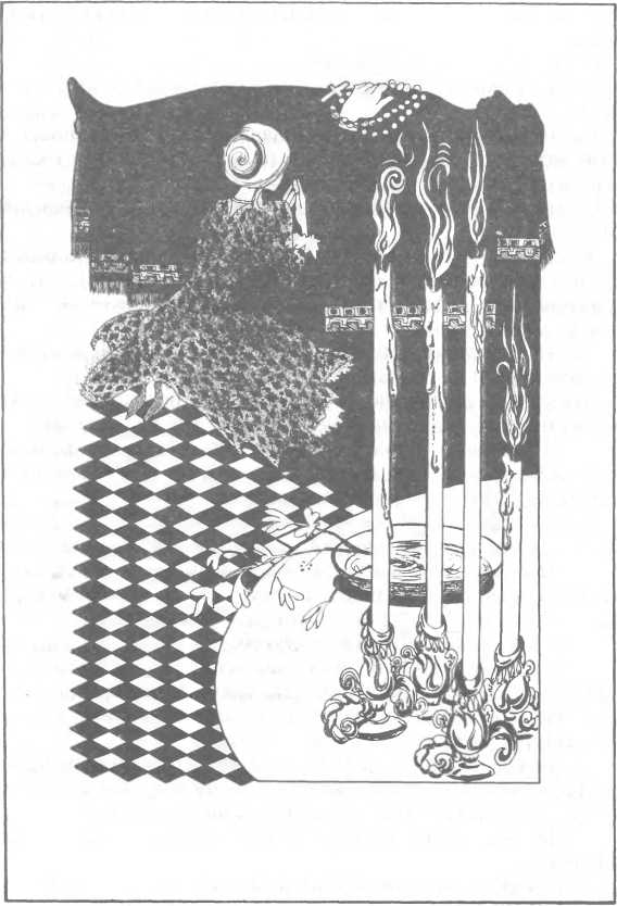 Между кроватью и столом молилась, опустившись на колени, молодая женщина, с головы до ног одетая в черное.