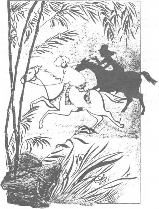 Благородное животное было таким сильным и энергичным, что бешеным прыжком смогло бы преодолеть препятствие и достичь противоположного берега; но в ту минуту, как конь устремился вперед, нога несчастного животного запуталась в веревке: одним концом заранее привязанная к бамбуку и тщательно спрятанная в тине и под обломками стеблей тростника, она внезапно натянулась, движимая с другой стороны невидимой рукой. Конь и всадник покатились в тинистую пропасть.