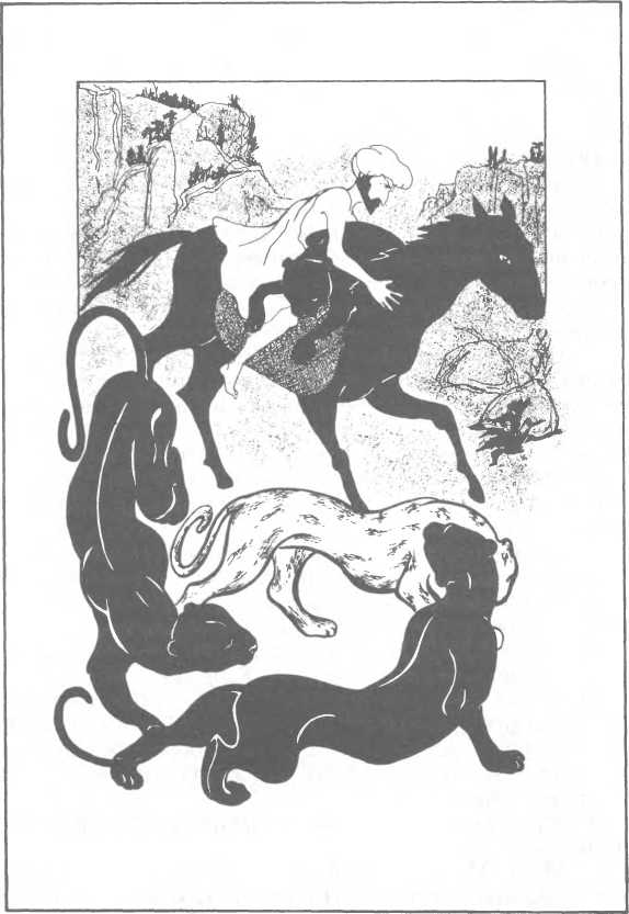 Через несколько минут гебру почудилось, что на кустах вдоль тропинки, по которой несся он в своей безумной скачке, шевелятся листья; скосив глаза в ту сторону, он увидел огромного зверя с пестрой шкурой, бежавшего рядом с конем, и разглядел в этом животном более крупную пантеру.
