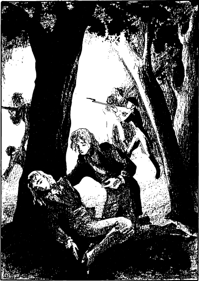 Прошло уже полчаса. Время от времени, как уже говорилось, свет луны пронизывал облака и позволял различить во главе колонны крестьянина-проводника под охраной двух солдат, шагающих по обе стороны от него; он прислушивался к малейшему шороху. Порой, когда сбоку слышался шелест листьев, шедшие во главе колонны замирали и сразу несколько голосов спрашивали: «Кто идет?» Никто не отзывался, и крестьянин пояснял со смехом: «Это заяц выскочил из лёжки!» Временами охранявшим его солдатам казалось, что они видят что-то подозрительное, но не могут ничего различить, и тогда один говорил другому: «Смотри в оба!» А вандеец замечал: «Это ваши тени! Вперед!» Вдруг на повороте дороги перед ними внезапно выступили два человека. Охранники хотели крикнуть, но один из двоих упал, не успев вымолвить ни слова, а другой, покачнувшись, смог только слабо позвать на помощь: «Ко мне!»