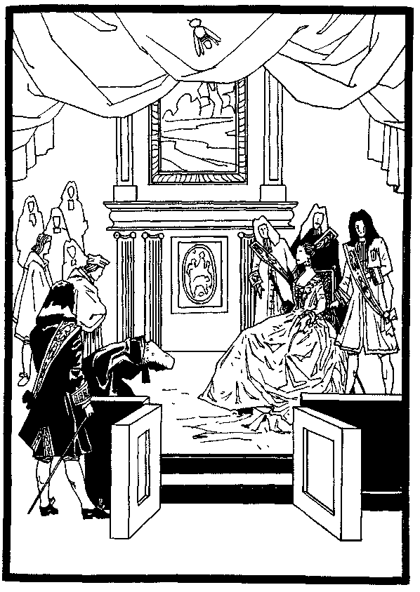 Ровно в четыре часа, то есть в час, на который было назначено начало церемонии, двустворчатая дверь гостиной распахнулась. В глубине большого зала, затянутого алым шелком, по которому были разбросаны вытканные золотом изображения пчел, на высоком троне торжественно восседала прекрасная фея Людовиза. Миниатюрная фигурка и тонкие черты лица герцогини дю Мен еще в большей мере, чем золотой жезл, который она держала в руке, придавали ей вид неземного существа, чье имя она носила. По знаку, поданному феей, все ее приближенные перешли из гостиной в зал и выстроились вокруг возвышения, на котором стоял трон. Магистры Ордена расположились на трех широких ступенях. Когда все заняли свои места, открылась боковая дверь и на пороге показался одетый в костюм герольда Бессак, начальник охраны герцога дю Мен. На нем была вишневая мантия, расшитая серебряными пчелами, а на голове – шляпа в форме улья.