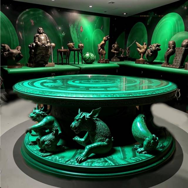 За дверью оказалась довольно внушительная комната с круглым каменным столом посередине и шестью небольшими тумбами вокруг него. Тумбы, были вырезанными из того же камня и изображали каких-то страшилищ, держащих у себя над головами что-то напоминающее обычное сидение. Алексей, усевшись на одно из них сказал, что оно довольно удобное, если конечно не обращать внимание на жесткость. Под столом, тоже были видны какие-то изваяния, но пока было непонятно, что они из себя представляют. Стол, после того, как на него попал луч света, длинному показался сделанным из цельного куска малахита. Хотя, откуда он тут взялся было совершенно непонятно. Семен, знал из детских сказок только об уральских месторождениях, хотя кто знает, может где-то есть и еще?