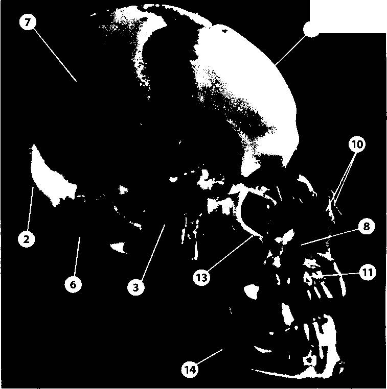 Мозговой отдел. Непарные кости: є – os frontale (лобная); 2 – os occipitale (затылочная); 3 – os sphenoidale (клиновидная); 4 – os ethmoidale (решетчатая кость) (на фото не видна); 5 – vomer (сошник) (на фото не виден). Парные кости: 6 – os temporale (височная); 7 – os parietale (теменная); 8 – concha nasalis inferior (нижняя носовая раковина); 9 – os lacrimale (слезная) (на фото не видна); 10 – os nasale (носовая). Лицевой отдел. Парные кости: 11 – maxilla (верхняя челюсть); 12 – os palatinum (нёбная) (на фото не видна); 13 – os zygomaticum (скуловая). Непарные кости: 1 4 – mandibula (нижняя челюсть); 15 – os hyoideum (подъязычная) (на фото не видна).