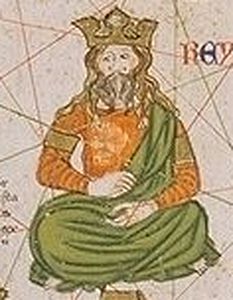 [Закрыть]. Корона вокруг шапки, впрочем, не идентична пятиконечной короне ильханских и пост-ильханских миниатюр. Скорее, это единственная из корон на Каталонском атласе с тремя зубцами, которые напоминают листья лимонного дерева. Известное изображение Фридриха II (1194–1259), короля Сицилии, демонстрирует явное сходство с короной, предпочитаемой автором Каталонского атласа[471]471