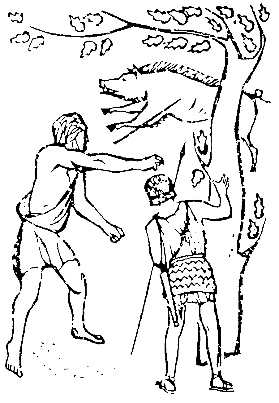 – Конечно, охота не занятие для мудреца, – продолжал Сократ. – Человек велик разумом. Но не следует осуждать тех, кто посвящает досуг охоте. Охота приносит смертным немало радости и воспитывает воинов. Недаром её освятили сами боги. Обо всём этом я думал, ожидая зверя. Он появился внезапно. Огромный, как чудовище, посланное Артемидою на калидонские поля. Маленькие глазки налились кровью. Чёрная щетина на загорбке вздыбилась. Я успел крикнуть своему питомцу: «Прячься за дерево!» И в это время выскочил раб. Дротик как молния сверкнул в его руке. И тотча же грудь зверя окрасилась кровью, хлынувшей из раны. Вепрь остановился, затряс мордой, словно пытаясь выдернуть дротик, и рухнул к ногам раба.