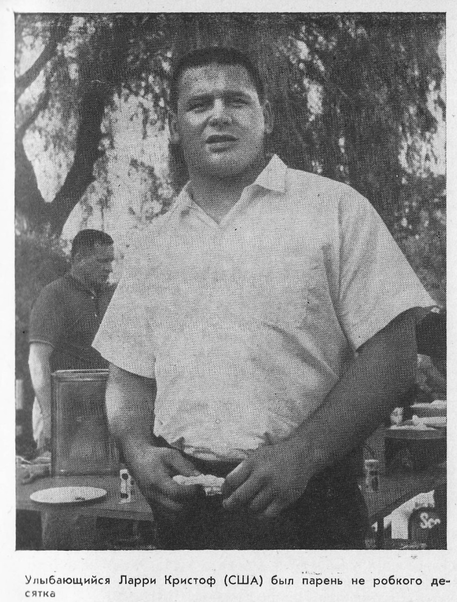 Ларри Кристоф оказался американцем болгарского происхождения. Его появление в кругу тяжеловесов на Токийской олимпиаде оказалось несколько неожиданным. США отнюдь не страдают отсутствием высокорослых мужчин, тем не менее в послевоенные годы в рядах их сборной по борьбе добротного тяжеловеса не было. Быть может, на сей счет были какие-либо причины, но в числе лидеров команда США не значилась. Поэтому, наверное, Ларри и обратил на себя всеобщее внимание. Стриженая голова Ларри мелькала в Олимпийской деревне повсюду. Такой бесшабашности оставалось только завидовать и надеяться, что начало турнира, сознание всей серьезности момента остепенят этого американца. Ничуть не бывало. Олимпиада набирала темп. Уже мы подержали в руках золотую олимпийскую медаль Гали Прозуменщиковой, которая первой из советских пловчих сумела завоевать столь почетный трофей. Саша взвесил медаль на ладони, дал поглядеть ее мне, затем мы вернули ее четырнадцатилетней школьнице. Понимает ли она, что удалось ей сделать, или в ее годы это очередная игрушка – блестящее елочное украшение?