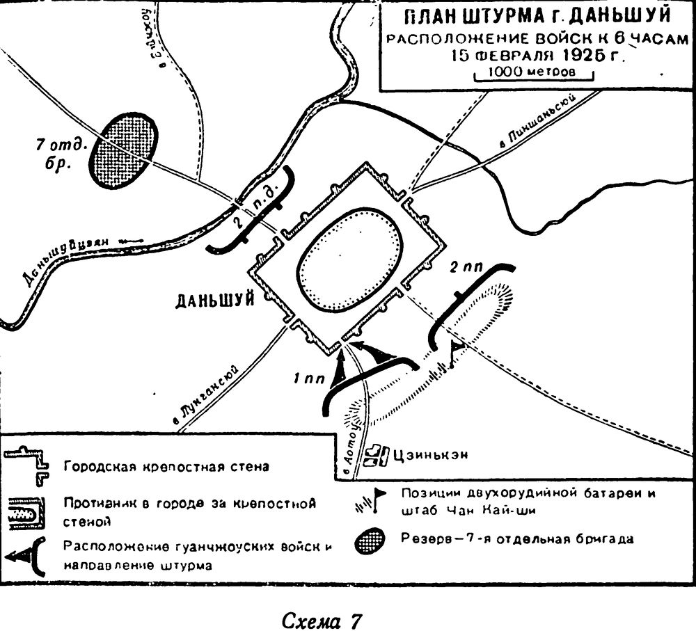 После мучительных колебаний Чан Кай-ши одобрил этот план. Был намечен основной пункт штурма – угол юго-восточной стены. Для операции выделялся 1-й пехотный полк, была поставлена задача батарее – пробить в стене проход для наступающих (схема 7).