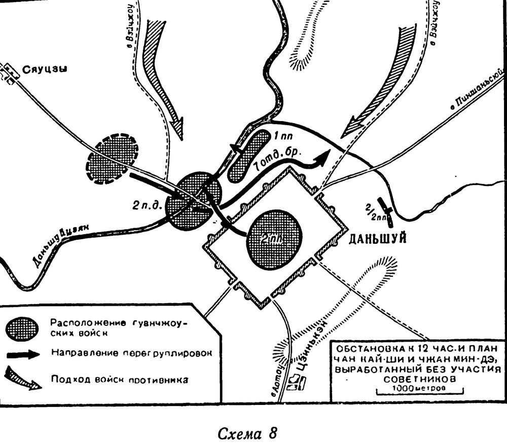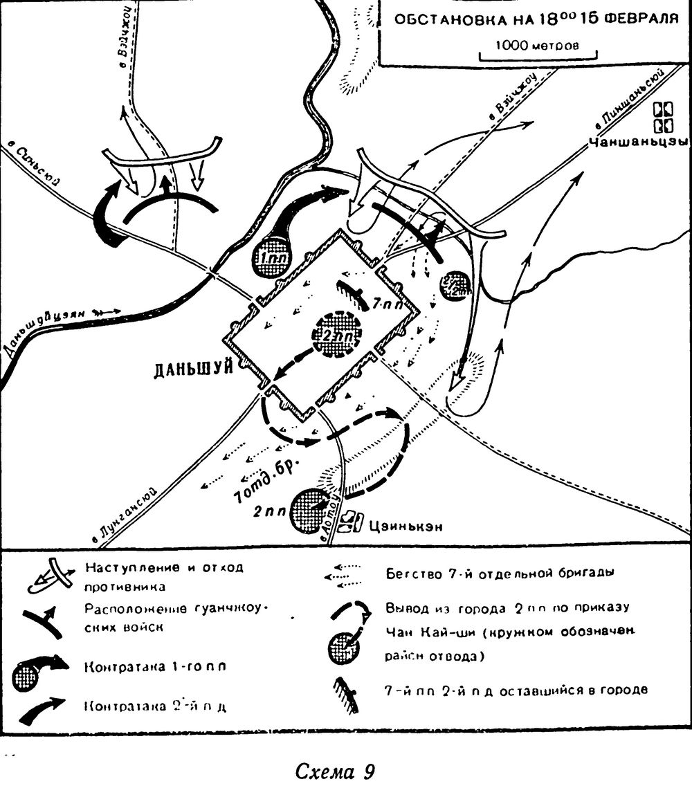 Не желая признаться друг другу, что они, генералы, перед тем как принять решение, советуются с нами, Чан Кай-ши и Чжан Мин-дэ около 12 часов дня встретились без советников и сами выработали план дальнейших действий. О своем решении как об окончательном Чан Кай-ши поставил в известность Степанова. Полки школы Вампу должны были выступить на восток вдоль побережья, в дальнейшем с подходом судов погрузить на них десант и высадить его в тылу противника, отступающего от Даньшуя; 2-й дивизии предписывалось двигаться на Пиншаньсюй, а 7-й бригаде – на Вэйчжоу. В. А. Степанова озадачил такой план. Предстояло действовать не кулаком, а растопыренными пальцами. В это время поступили сведения, что из Вэйчжоу на помощь к противнику подошли новые части – около 2 тыс. человек. Генералы вновь без участия советников выработали план действий на 16 февраля, в соответствии с которым 2-я дивизия и 7-я бригада, сосредоточившись на восточном берегу реки к северу от Даньшуя, должны были атаковать противника с охватом его левого фланга. Чан Кай-ши собирался 15 февраля перебросить на левый берег реки к западу от города свой 1-й полк. 16-го утром направить туда же 2-й полк и перейти в наступление в северном направлении с охватом правого фланга. Предполагалось, что эти части во взаимодействии со 2-й дивизией окружат противника. При перегруппировке намечалось ненужное перекрещивание частей (схема 8).