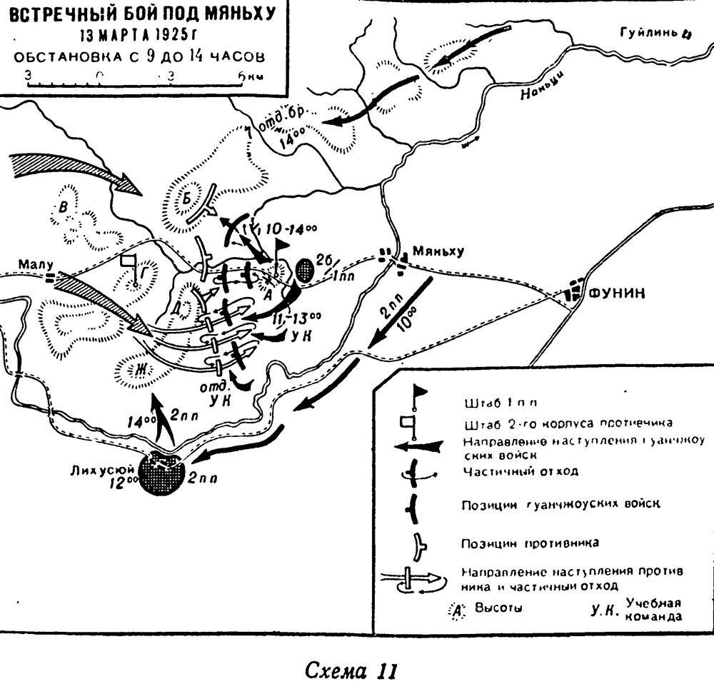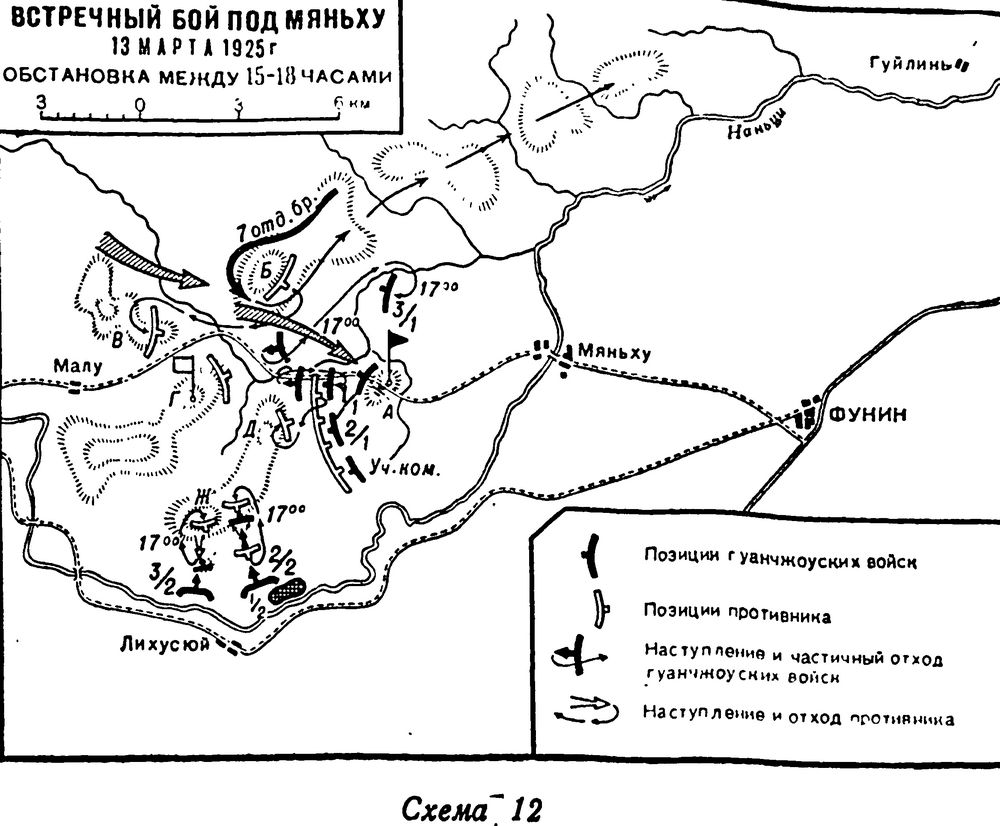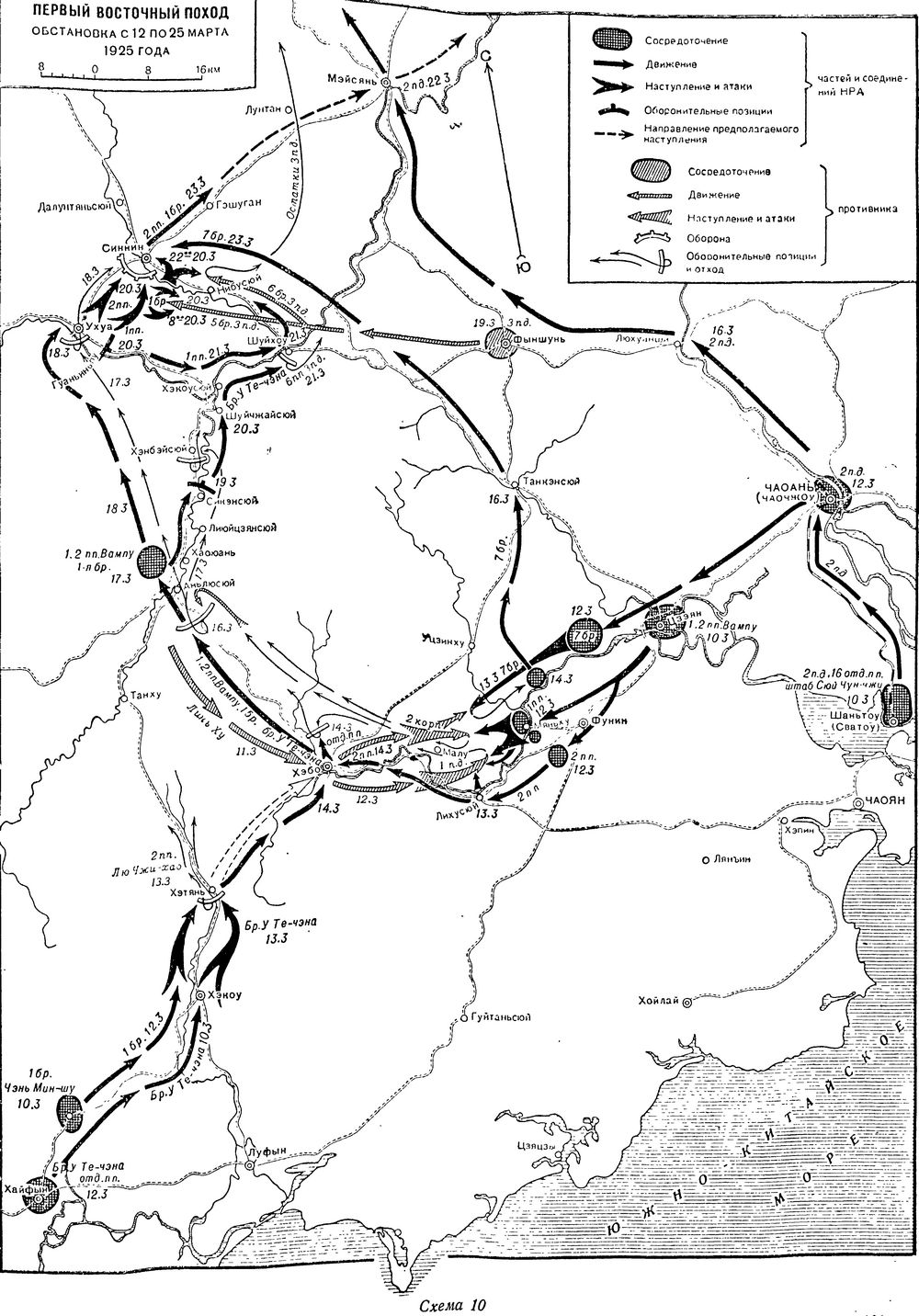12 марта наши войска заночевали в следующих пунктах: 7-я бригада – на северном берегу р. Наньци западнее Цзэяна; 1-й полк школы Вампу – в Мяньху (один батальон на левом берегу р. Наньци), 2-й полк – юго-восточнее Мяньху; 2-я дивизия – в Чаочжоу (схема 10). От бригад, двигавшихся с запада на Хэбо, сведений не поступало, предполагали, что они находятся в полупереходе от этого пункта.
