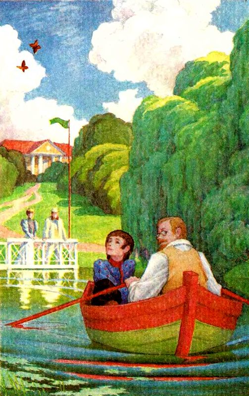 Никита вошел в лодку и сел на руль. Аркадий Иванович взялся за весла. Лодка осела, качнулась, отделилась от берега и пошла по зеркальной воде пруда, где отражались ветлы, зеленые тени под ними, птицы, облака. Лодка скользила между небом и землей. Над головой Никиты появился столб комариков, – они толклись и летели за лодкой.