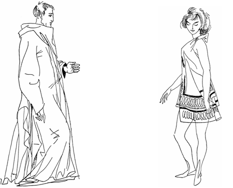 Од впервые замечает, как красивы руки Ии, как нежна смуглая кожа, какая глубина мысли и знания в больших синевато-зеленых глазах. Чуть откинув голову, она все еще не может справиться с тяжелыми прядями волос и смущенно улыбается. Вместо широких белых одежд, которые носят женщины на Эне, скрывающих фигуру, шею и руки, на ней короткая, красная, шитая серебром туника. Ожерелье из мерцающих красноватыми огнями камней на смуглой шее. Тонкая серебристая ткань трико плотно облегает стройные длинные ноги. Красота давно минувших поколений возродилась еще раз в этой последней дочери энов…