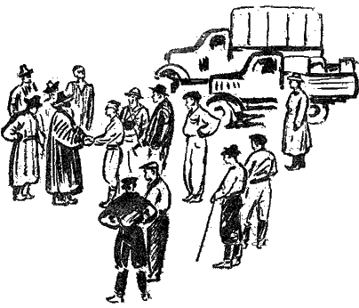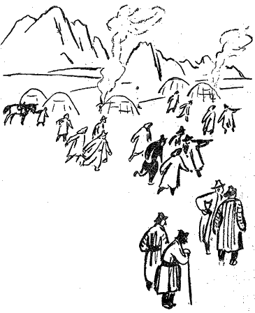 Прибытие каравана машин вызвало переполох в стойбище аратов. Отовсюду – из войлочных юрт, от костров, из-за ближайших холмов к машинам шли и бежали мужчины, женщины, дети в ватных халатах и островерхих меховых шапках; махали руками, переговаривались на ходу, кричали, показывали на машины и на покрытые снегом скалистые гребни недалеких гор.