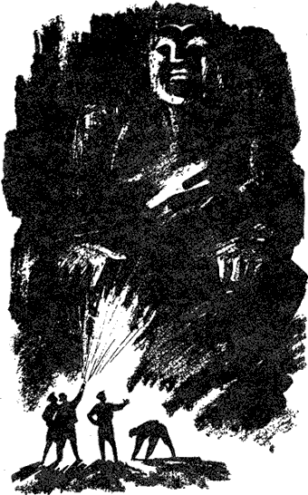 И вдруг впереди забрезжил слабый свет. Коридор кончился. Они очутились в огромном круглом зале. Свет проникал откуда-то сверху и падал на каменное лицо огромного изваяния, высеченного в стене зала.