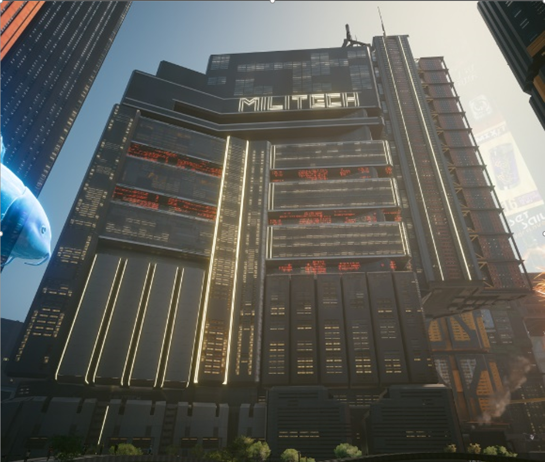 Здание Militech в ночном городе прекрасно отображало суть американской военной машины – это громадный почти квадратный небоскреб в стиле милитари или военной диктатуры. Красные, серые и золотые тона, агрессивный стиль, неизвестный дизайнер прекрасно постарался над заказом производителей оружия. Хотя, наверное, любая мегакорпорация должна заниматься производством оружия? Даже ближайшие противники американцев – япошки, не только софт и импланты сверхсовременные производят, их основной заработок – оружие и военная мощь.