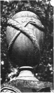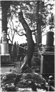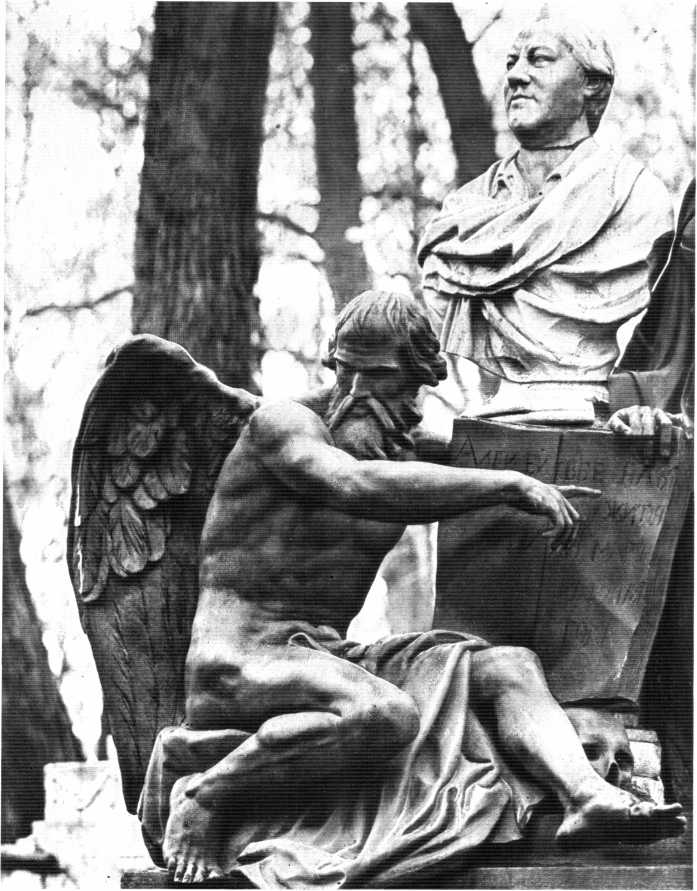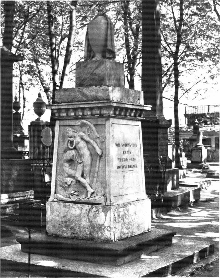 Совершенно необычен, несомненно навеян романтическими образами памятник мальчику А. Чичерину – превосходно, с великолепным мастерством изваянная птица Феникс, вздымающая крылья в пламени костра... Романтический характер имеет и памятник молодому кавалергарду А. Я. Охотникову, таинственная смерть которого породила толки в начале 1800-х годов и отражена в исторической литературе и художественных произведениях[67]. Памятник представляет собой грот, обработанный в виде грубо отесанных глыб гранита, завершенный беломраморным изображением сломанного бурей дубка и печальной фигурой плакальщицы над урной у его подножия. Поэтичность образа усиливают такие детали, как якорь и маленькая мраморная доска рельефа, изображающая Гения у саркофага и плакучую березу.