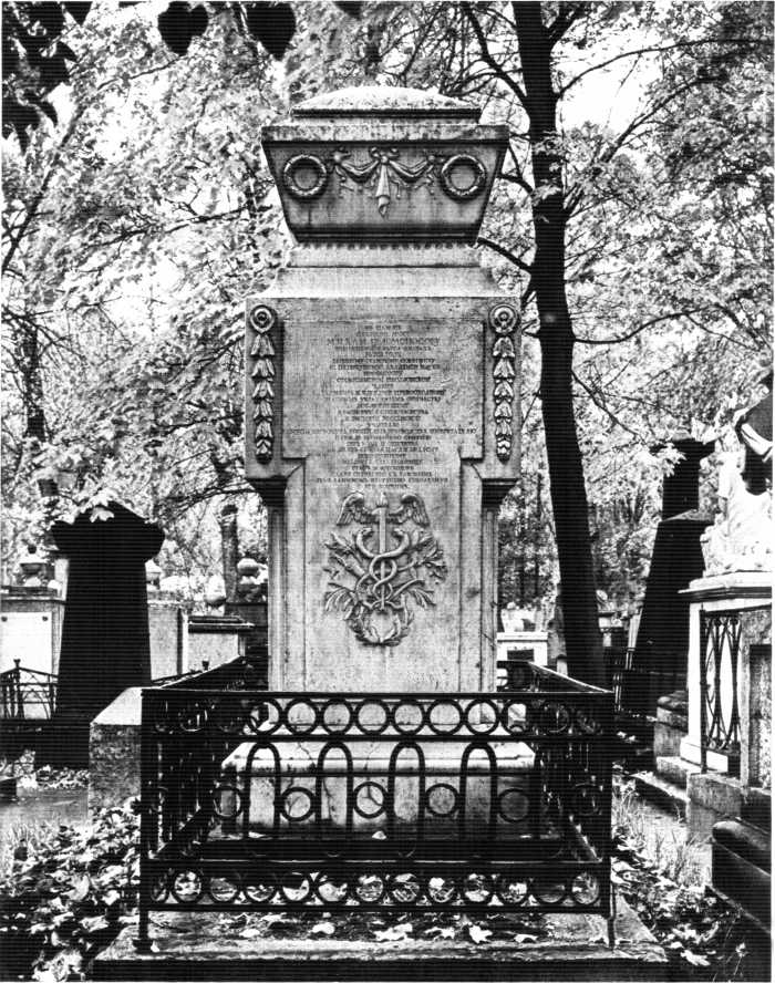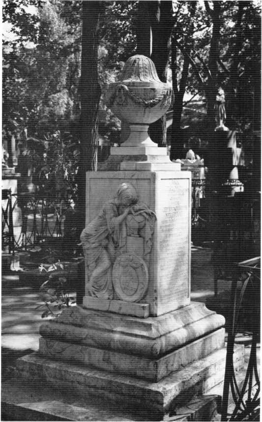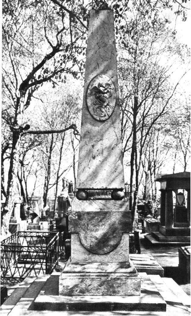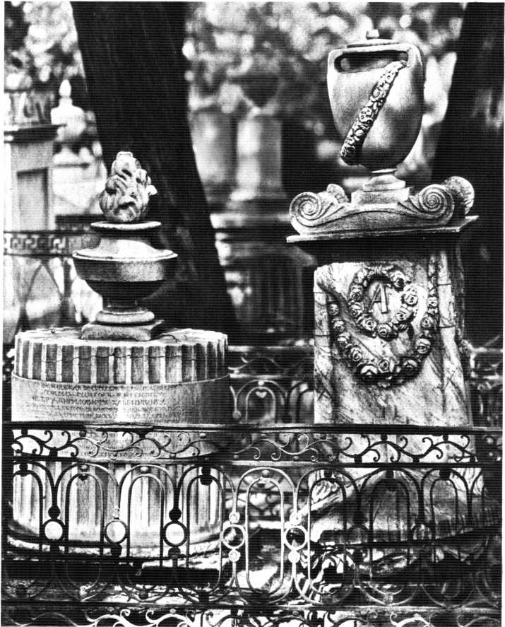 Появляется и круг новых образов, новых символов или находят дальнейшее развитие старые, уже вошедшие в образный строй мемориального искусства в минувшем веке. Памятники приобретают ярко выраженную эмоциональную окраску в духе сентиментализма или романтизма, формально развивавшихся в общем русле высокого классицизма, который, достигнув наивысшего подъема в первую греть XIX столетия, уже с 1820-х годов постепенно теряет глубокое содержание и к середине века перерождается в холодную форму академизма. Памятники некрополя начала XIX века еще не отличаются образным строем и формами от надгробий конца XVIII века. Таков, например, легкий, стройный пристенный обелиск на постаменте с тремя маленькими беломраморными светильниками, лепной золоченой ветвью изящного рисунка и золоченым медным гербом с геральдическим слоном и латинской надписью «Fummo» (стреляю)[66]. Его соорудили «родня [...] и ближни» сына «арапа Петра Великого» – И. А. Ганнибала, воина, артиллериста, о котором повествуют герб, девиз, изображение пушки и эпитафия: «Зной Африки родил, хлад кровь его покоил, России он служил, путь к вечности устроил». Форму обелиска, на этот раз монументального, воспринятую от XVIII века, имеет и памятник адмиралу П. И. Ханыкову. В 1810 году сооружается надгробие в форме усеченной колонны со светильником на могиле выдающегося архитектора, строителя Троицкого собора лавры И. Е. Старова. Образный строй этих памятников спокоен и торжественен, эмблематика очень сдержанна и традиционна. Однако в те же годы начинают получать широкое распространение иные символы и изображения, ранее встречавшиеся редко или не встречавшиеся вовсе: якорь (целый или переломленный) как символ надежды, голубки и горлицы, смятые или сорванные цветы, разбитые лиры, полуразрушенные колонны, деревья, сломанные бурей, и т. д. В классические формы жертвенника, обелиска, саркофага, стелы эта символика привносит сентиментально-романтические ноты. Так, например, небольшие тщательно изваянные в мраморе рельефы памятников М. Б. Яковлевой (осиротевшие птенцы в гнезде и потерявший подругу «пернатый вдовец» на ветке) и Е. Н. Карпову (розовое деревце со сломанным цветком) невольно заставляют вспомнить «чувствительные» строки Н. Карамзина: «Две горлицы покажут /Тебе мой хладный прах: /Воркуя томно скажут. /Он умер во слезах!» Лирическая интимность, «печаль осиротевшего сердца» сообщаются многим памятникам, а иные из них, такие, как прекрасно исполненные жертвенники Меншиковым, украшенные высеченными на них венками и увенчанные урнами, могут сами служить поэтическими символами печали.