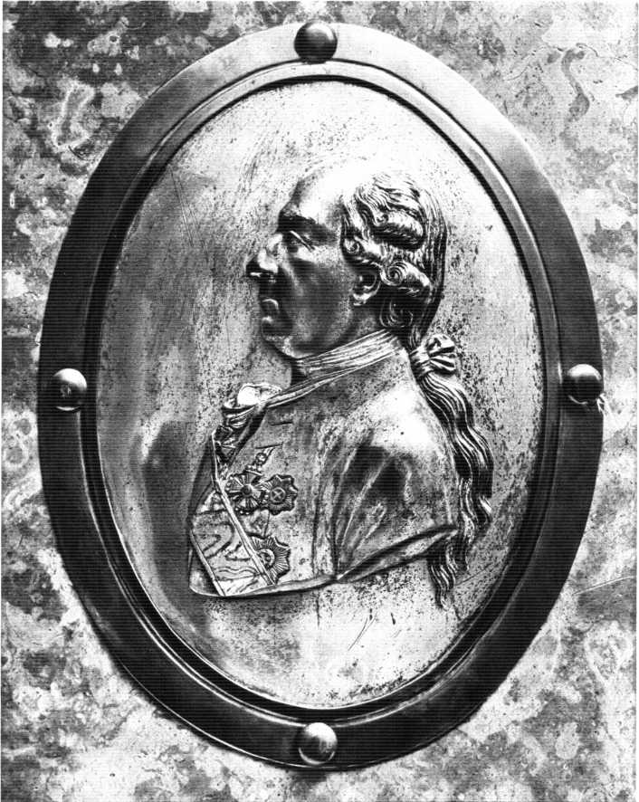 К сожалению, памятник Нарышкину или не был исполнен так, как задуман Мартосом, или сохранился частично. Во всяком случае в палатке Благовещенской усыпальницы[57] стоит только центральная (уцелевшая?) часть надгробия – жертвенник с барельефным медальоном. Она свидетельствует о портретном мастерстве Мартоса и его повышенном интересе в этот период к многоцветности и разнообразию материалов: пестрый полированный олонецкий мрамор постамента, потемневшая теплая бронза венка, белый мрамор медальона и матовая чернота доски на цоколе с эпитафией, напоминающей, что «от племени их Петр Великий произошел»[58].