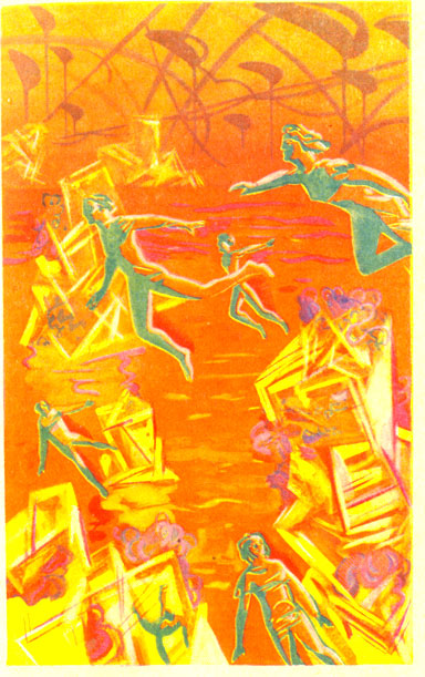 Вот и вестибюль. Наши шаги гулко отдаются под высокими сводами. Стены вестибюля покрыты изумительной по выразительности живописью, рассказывающей о завоевании грианами Космоса. Мы видим устремленные к звездам причудливые корабли, астронавтов, высаживающихся ста планеты, которые напоминают то дантов ад, то райские сады. Среди уродливых деревьев выглядывают чудовищные морды зверей. Вероятно, гриане знали какие-то новые методы изображения на плоскости: предметы на картинах имели глубину, а люди и животные казались настолько живыми, что я невольно протянул руку, пытаясь проверить свое впечатление, и… наткнулся на холодный камень стен.