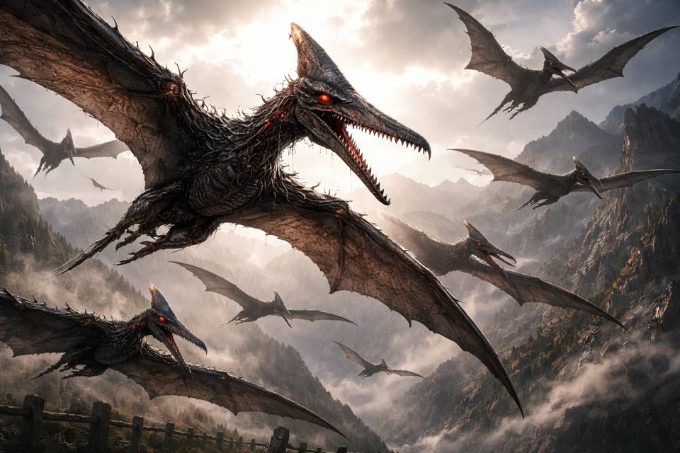 Стая. Пять, шесть… нет, восемь. Гигантские летающие ящеры с перепончатыми крыльями, и каждое крыло было десять, может двенадцать метров от кончика до сустава. Длинные, вытянутые черепа с клювами, усеянными мелкими острыми зубами, и маленькие злые глаза, красные, неподвижные. Они заходили на площадку сверху, из слепящего солнца, и каждый взмах крыльев гнал вниз ударную волну, от которой шатались столбики ограждения и прижимало к бетону.