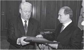 Президент Борис Ельцин передаёт президентский экземпляр Конституции Российской федерации Владимиру Путину. 31 декабря 1999 г.
