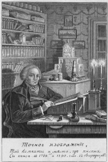 Илл. 20. Автопортрет Андрея Болотова. Текст подписи: «Точное изображение той комнаты и места, где писана сия книга в 1789-м и 1790 годах в Богородицке».