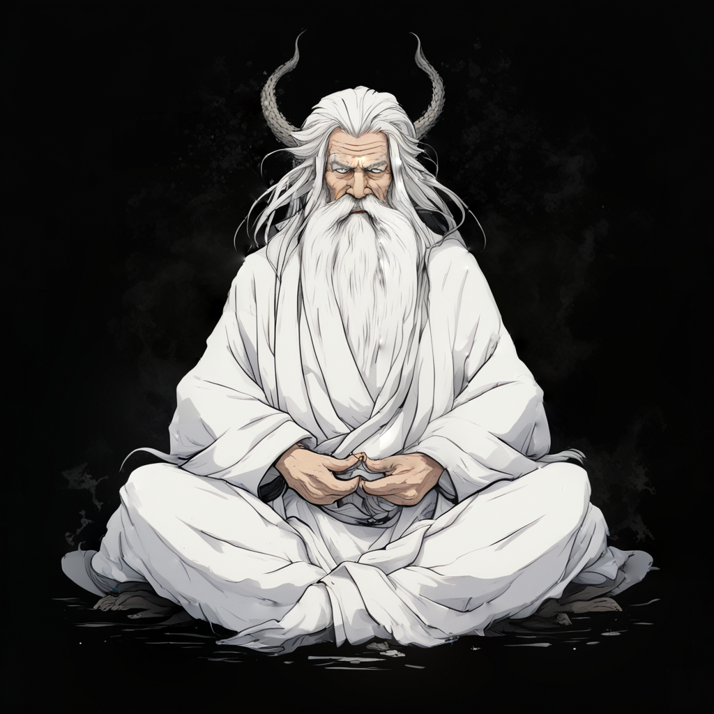Тем временем мы с Казимиром шли где-то в районе желудка дракона. Впереди была видна крупная каменная плита, на которой в позе лотоса сидел величавый старец в белых одеждах, его голову венчала пара рогов. Стариком его назвать язык у меня не повернется. Одна только аура исходящая от этого аватара давила словно пресс. Величие, исходящее от него, буквально заставляло склонить голову перед непостижимым существом. Только силой воли я удержался от того, чтобы преклонить пред ним колени.