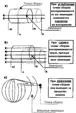 На рис. 4а показано углубленное положение точки сборки. Она изображена здесь в виде цилиндрика, этакого отрезка энергетической трубки, которая призвана определенным образом собирать в пучок привходящие в кокон внешние излучения. Это самое распространенное положение: точка сборки «всего лишь» несколько сдвинута вглубь ауры.