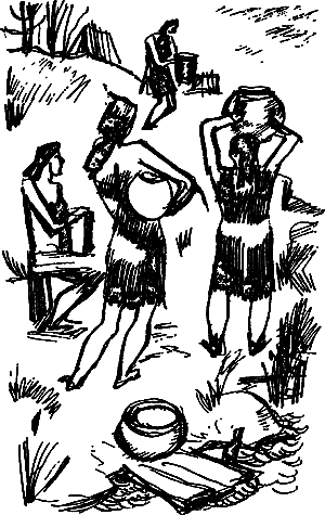 …Без малого три луны понадобилось свадебной дружине, чтобы от Ку-Пио-Су добраться до Свайного поселка. Много дней странствовали они по озерным берегам, посещая разные рыбацкие поселки. Впрочем, таких поселков встретилось немного. Робкие жители первого из них разбежались, завидев издали приближающуюся флотилию лодок. С большим трудом удалось вызвать людей из березняка, куда они попрятались в страхе перед чужими.