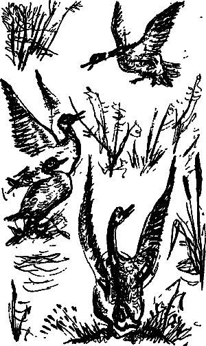 В первые дни охотники не пропускали ни одной птицы и поедали даже жесткое мясо гагар. Потом они начали охотиться с разбором. Куда бы ни ступила нога охотника, всюду кишела дичь! Над озерами и озерками, от болотистых кочек до тихих стариц Выга и его притоков стоял стон от тысяч птичьих голосов. В воздухе и на воде, по болотам и вдоль берегов взлетали и камнем бухали в воду, перелетали с места на место, дрались и суетились неисчислимые стаи птиц.