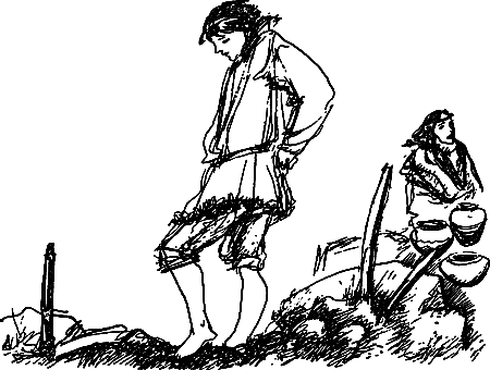 К ним приближалась немолодая уже женщина. Она пинками подгоняла упиравшегося, багрового от смущения подростка. Это мать, стыдясь всех встречных, вела незадачливого сына Мэку, которому Кремень в наказание приказал лепить наравне с женщинами горшки до тех пор, пока он не станет настоящим мужчиной, стойко переносящим боль. Девушки охотно предоставили тяжелую работу опозорившемуся юноше.
