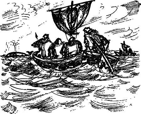 Бормоча заклинания об удаче, Кремень привязал на мачту поперечную жердь с прикрепленным к ней парусом. Парус надулся, ладья, как живая, вздрогнула и рванулась в море. Дул попутный ветер, и четырем гребцам, сидевшим на дне лодки, нечего было делать. Лишь один из них держал шест с прикрепленным к нему нижним краем паруса и, отклоняя его то в одну, то в другую сторону, направлял ладью туда, куда знаками показывал Кремень. Старик сидел на носу лодки, прижимаясь грудью к борту. Приставив ко лбу ладонь и жмурясь от мерцающей ряби, он зорко смотрел вдаль. Рядом, прикрытые куском оленьей шкуры, лежали метательный гарпун с кособоким, хотя и старательно отточенным наконечником, свернутый в большое кольцо длинный, тонкий ремень и привязанный к нему туго надутый воздухом пузырь из цельной шкуры тюленя.