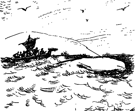 Счастье продолжало сопутствовать людям. Раненый кит с разгона пронесся мимо их ладьи. Он бил хвостом, вздымая высокие волны. Следуя за мечущимся зверем, далеко в стороне плясала по гребням надутая пузырем шкура.