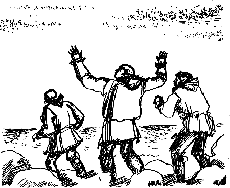 На рассвете в одной из землянок на краю селения проснулся подросток от странных, тревожных звуков, разносившихся по стойбищу. Он выглянул за полог и, отпрянув назад, стал расталкивать мать. Та выбежала из землянки и увидела, что вблизи сидит колдун, раскачивается, разводит руками и заунывным голосом сзывает сородичей. Женщина сбегала к соседке, ребятишки подняли других женщин, и скоро позади колдуна собралась целая толпа. Заглянуть в лицо колдуну никто не решался, все понимали, что он говорит с духами, а кто же посмеет стать между колдуном и теми, с кем он беседует?