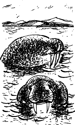 Как только ударили крепкие морозы и вдоль берегов залива протянулась полоса льда, охотники вышли на трудный и опасный моржовый промысел. Шкура у моржа такая толстая, что ее не пробивает ни каменный, ни костяной наконечник. Лишь на загривке, под толстыми складками, кожа у него потоньше, но складки разглаживаются, когда морж скачками передвигается по льду, опираясь на короткие ласты. В уязвимое место и должен ударить охотник копьем или гарпуном, а для этого ему нужно подобраться к зверю вплотную.