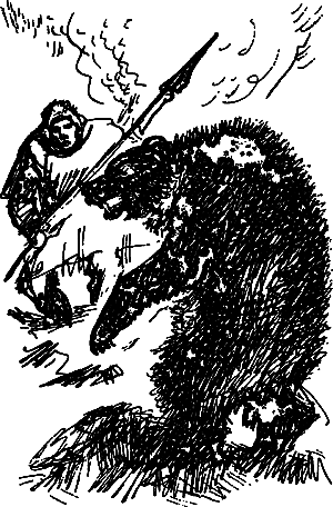 Но перед зверем был человек, вооруженный копьем. Медведю не удалось незаметно подкрасться к Ау. На охотника пахнуло зловонием гниющих ран и медвежьей шкуры. Ау зашел за костер и, уперев конец древка в ногу, выставил острие копья вперед. Огромная туша перемахнула прямо через огонь. Наконечник копья, пропоров медвежье брюхо, врезался в кишки и вышел наружу. Но древко не выдержало и переломилось, как сучок, и страшная тяжесть обрушилась на Ау и придавила его. Теперь некому было подкладывать хворост в костер, и он понемногу начал гаснуть.
