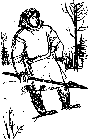 Вдруг из гущи ельника показался лыжник. На плечах его, спереди и сзади, висело по большому глухарю. Человек остановился, выставив вперед копье, но Бэй с криком «ей-ей!» отшвырнул в сторону дротик и, подняв руки, пошел навстречу незнакомцу. Тогда тот, воткнув в снег копье, сделал несколько шагов вперед.