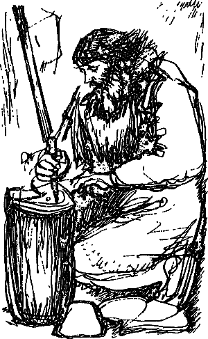 Кибу сидел у входа в землянку. Это был тот самый, заросший волосами старик, которого они видели вчера у колдуна. Перед ним на двух камнях лежала большая плоская плита. Склонив над ней кудлатую голову, старик затачивал сланцевый топор, осторожно водя им взад и вперед по шлифовальной плите.