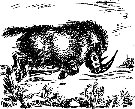 Вдруг Улла со страхом стал пятиться от кустов лозняка. Оттуда пристально смотрело на него темное мохнатое чудовище. Это был длинношерстный носорог. В те времена эти звери еще бродили по равнинам Европы. Носороги были неприхотливы в еде. От холода их защищала густая шуба из длинных темных волос.
