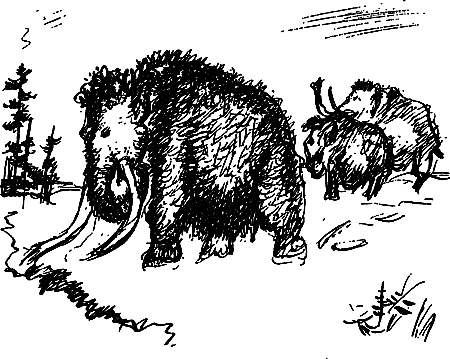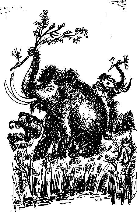 Действительно, это были мамонты. Они медленно пробирались по течению узенькой речки, густо заросшей корявыми кустами. Речка была узка, и воды издали не было видно. Только полоска береговых ивняков обозначала ее извивы. Хуммы ломали хоботами ветки и отправляли их в свои ненасытные рты. Широкие уши шевелились и топорщились. Детеныши то спускались в воду, то вылезали на берег.